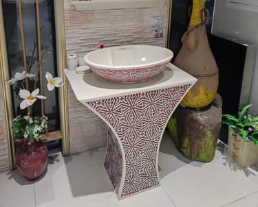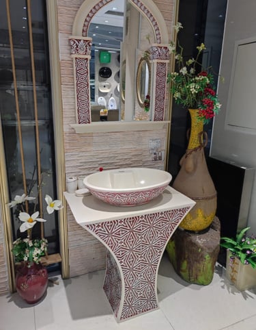 Bring timeless artistry into your space with the VIVISA Moroccan Mosaic Basin Set. This stunning piece draws inspiration from rich Middle Eastern and Indo-Mughal motifs, showcasing intricate geometric patterns in earthy red tones over a classic ivory base.